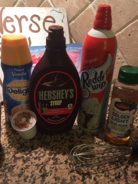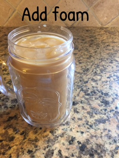 Grab another small cup and whisk together 1 tablespoon of French Vanilla and a swirl of Reddi Wip until in becomes foamy (about a minute). Let sit a minute.